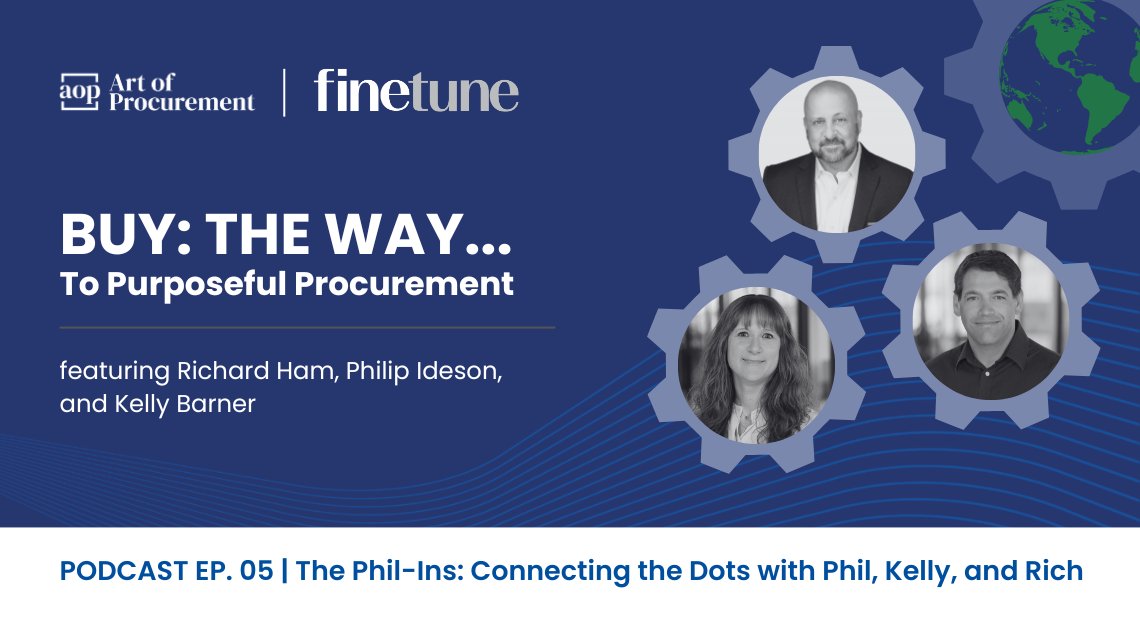 In this episode of “Buy: The Way… To Purposeful Procurement,” Rich Ham, CEO of Fine Tune, and Philip Ideson and Kelly Barner of Art of Procurement, reflect on what we heard from Oliver Hurrey and Brian Kyle in episodes 3 (Oliver’s List: Inspiring Tales of Purposeful Procurement with Oliver Hurrey) and 4 (Mission Possible: Unburdened Procurement with Brian Kyle) and explore how these procurement leaders find purpose and passion in their work, no matter how big or small the project is.